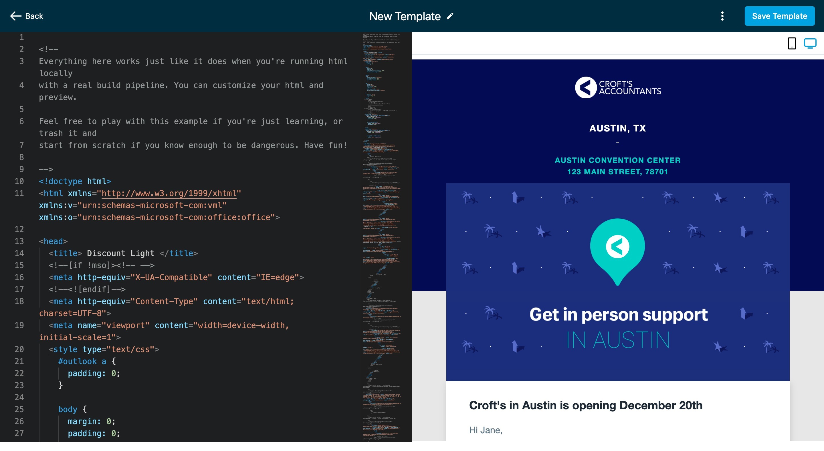 3. There will be a popup window with the option of Design Editor (drag and drop builder) and Code Editor (HTML builder). The user needs to select the Code Editor.