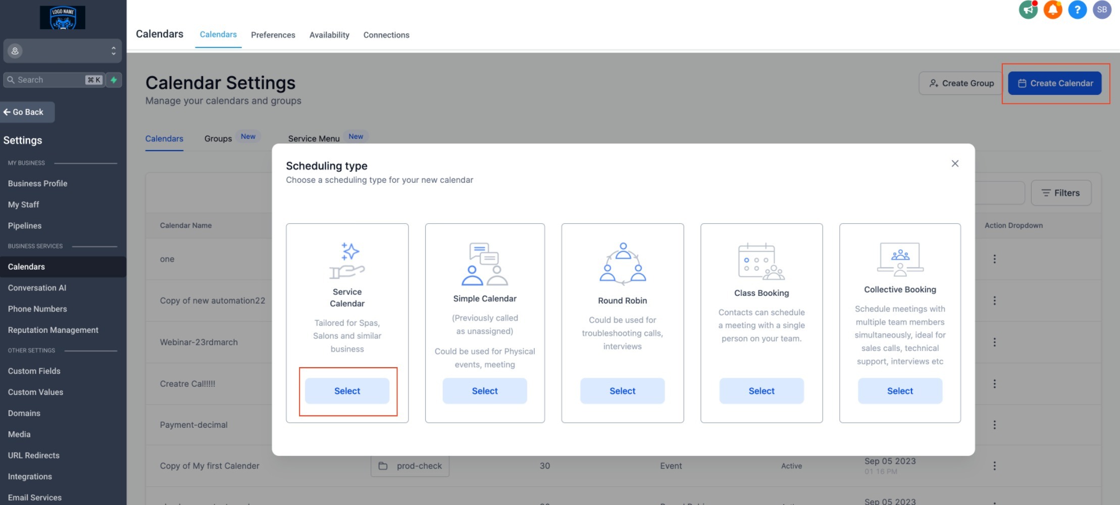 - Within the Calendars Tab, click "Create Calendar," then choose the "Service Calendar" option.