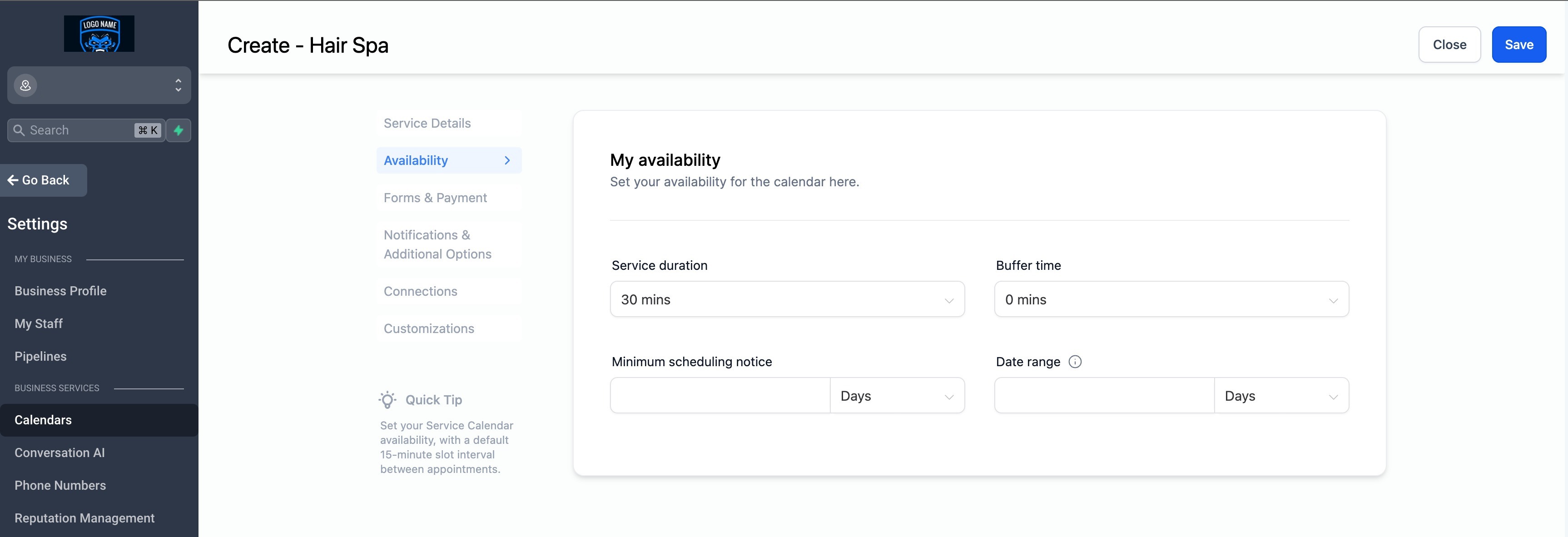 3. Crucially, the availability of the service calendar is directly linked to the schedules of the staff members assigned to it. Hence, there is no option to configure the Calendar Availability. The calendar will consider the availability of only it's assigned staff members. If a staff member is unavailable at a given time, the calendar will reflect this unavailability.