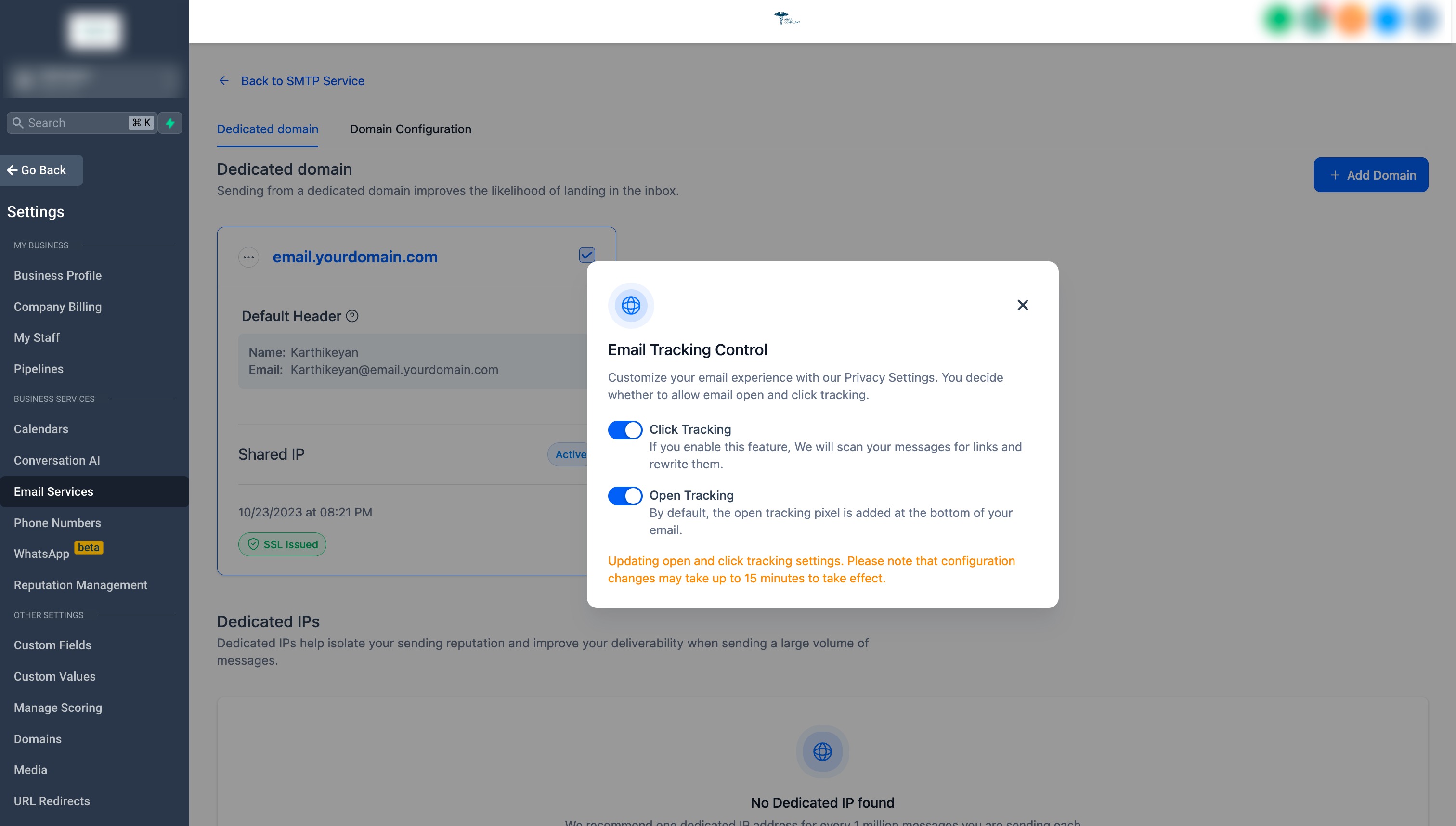 - Navigate to Sub-account Settings - Email Service -> SMTP Service -> Dedicated Domain and IP -> Domain settings under dedicated domain.